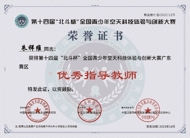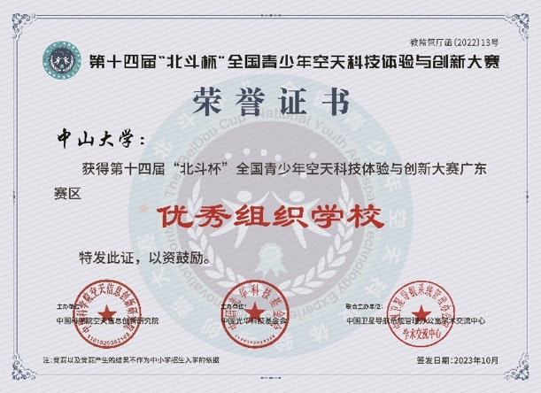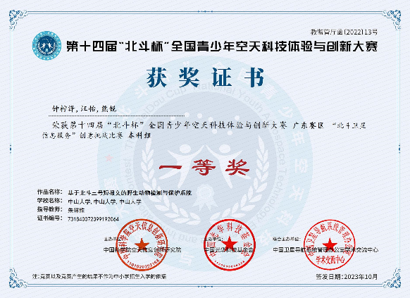 在10月28日举办的第十四届“北斗杯”全国青少年空天科技体验与创新大赛上,电子与通信工程学院2021级本科生钟柠泽、汪怡、熊锐在朱祥维教授的指导下完成的作品“基于北斗三号短报文的野生动物检测与保护系统”,在获得第十四届“北斗杯”全省一等奖后,又获得了全国一等奖。中山大学荣获广东省赛区优秀组织单位,朱祥维教授荣获优秀指导老师荣誉。